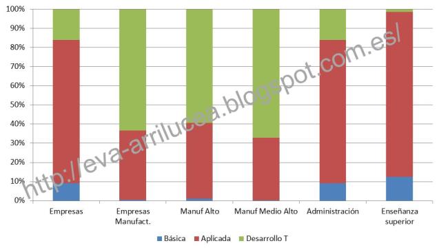 Tanto en empresas, como en administración pública y enseñanza superior, el foco en Euskadi está centrado en la investigación aplicada. Curiosamente (o no tanto) si investigamos un poco más dentro del grupo de empresas, las manufactureras con nivel tecnológico elevado rompen esta dinámica y se acercan más al desarrollo tecnológico. El propio mercado las está llevando ahí. Se me ocurre que los demás (centros tecnológicos y universidades principalmente) deberíamos acompañarles aún más en esta tendencia y volcar nuestros esfuerzos en que el conocimiento y la tecnología se conviertan en resultados que se puedan comercializar, que se puedan exportar y que aporten valor añadido.