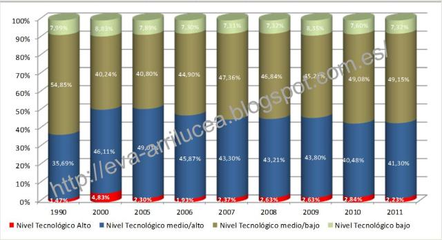 Una consecuencia lógica de tener una estructura industrial que no despega en cuanto a contenido tecnológico alto es que nuestras exportaciones de nivel tecnológico alto tampoco despegan, lo que afecta directamente a nuestra competitividad. Lo que podéis ver en el siguiente gráfico es el peso porcentual por contenido tecnológico sobre el total de nuestras exportaciones: