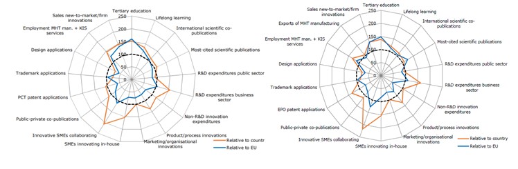 En relación a Europa tenemos debilidades claras en aplicación de diseños, patentes y marcas y en la generación de innovación en cualquiera de sus modalidades (proceso, producto, mercado y organización), así como en el número de PYMEs que innovan y en la inversión pública en I+D. Respecto a la edición anterior del indicador (RIS2017) hemos perdido posiciones en cuanto a publicaciones citadas, PYMEs innovadoras y colaboración entre PYMEs.