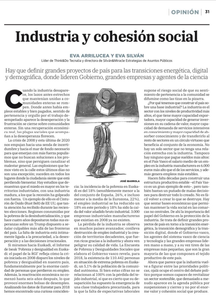 Hoy El Correo y en El Diario Vasco publican el artículo que he escrito en colaboración con Eva Silván, donde ponemos de manifiesto la importancia de mantener una industria de alto valor añadido para garantizar la cohesión social y la prosperidad en un territorio.